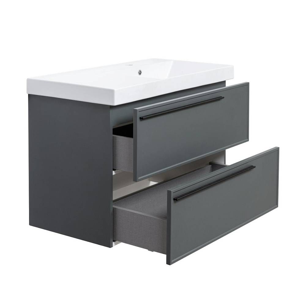 Тумба под раковину La Fenice Elba TWIN FNC-01-ELB-G-90-2 87.6 смПодвесная тумба La Fenice Elba TWIN FNC-01-ELB-G-90-2 обладает рядом неоспоримых преимуществ. Тумбу можно оснастить правосторонней или левосторонней встраиваемой раковиной (арт. CU.NN.90R или CU.NN.90L), либо же приобрести столешницу в подходящем цветовом решении (арт. FNC-03-PL01-90, FNC-03-VS03-90) и установить на неё раковину-чашу. За счет входящего в комплект сифона Prevex, тумба обладает полноценными ящиками для хранения (без выреза). Ящики выполнены в фантазийной цветовой гамме "Лён антрацит". Тумба оснащена скрытыми доводчиками плавного закрывания частичного выдвижения Samet (Турция) и подвесным регулируемым механизмом Camar (Италия). Фасад и корпус тумбы покрыты краской и матовым лаком, что является надёжной защитой от влаги. Прекрасным и функциональным дополнением к тумбе станет пенал La Fenice Elba серо-зеленого цвета FNC-05-ELB-G-30