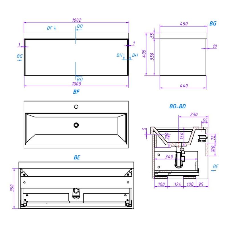 Габариты корпуса тумбы (ШхВхГ): 1000х350х440 мм.