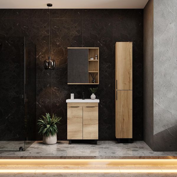 Напольная тумба для ванной комнаты Onika Легран 60 - это сочетание насыщенного древесного декора и благородства металла: роскошная текстура и натуральный цвет дуба дают теплоту, а черная матовая фурнитура добавляют урбанизма и солидности.