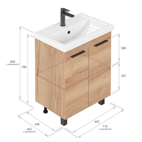 Размеры тумбы без учета раковины и ножек 66x44x68 см.