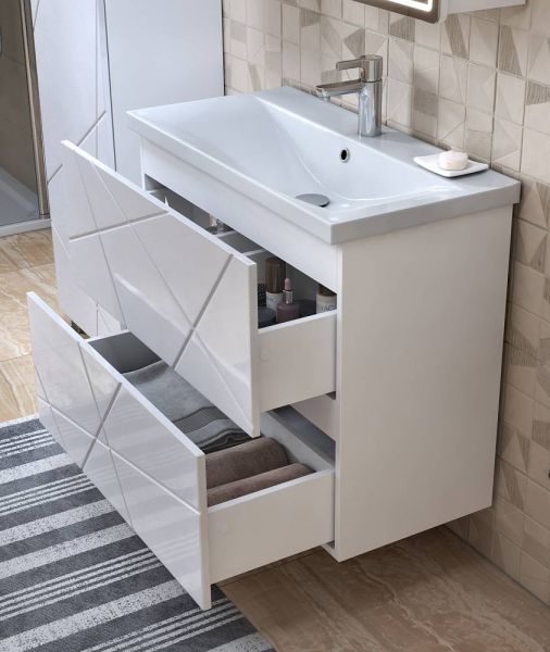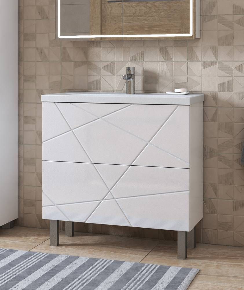 Напольная тумба. 2 ящика; опоры квадратные регулируемые.Специальный сифон Vigo в комплекте. Материл корпуса тумбы: влагостойкая ЛДСПМатериал фасадов: МДФПокрытие: пленка ПВХЯщики: направляющие полного выдвижения, механизм push-to-open
