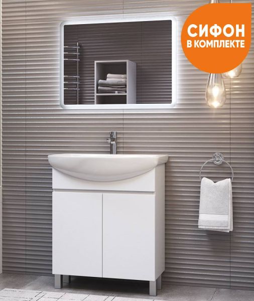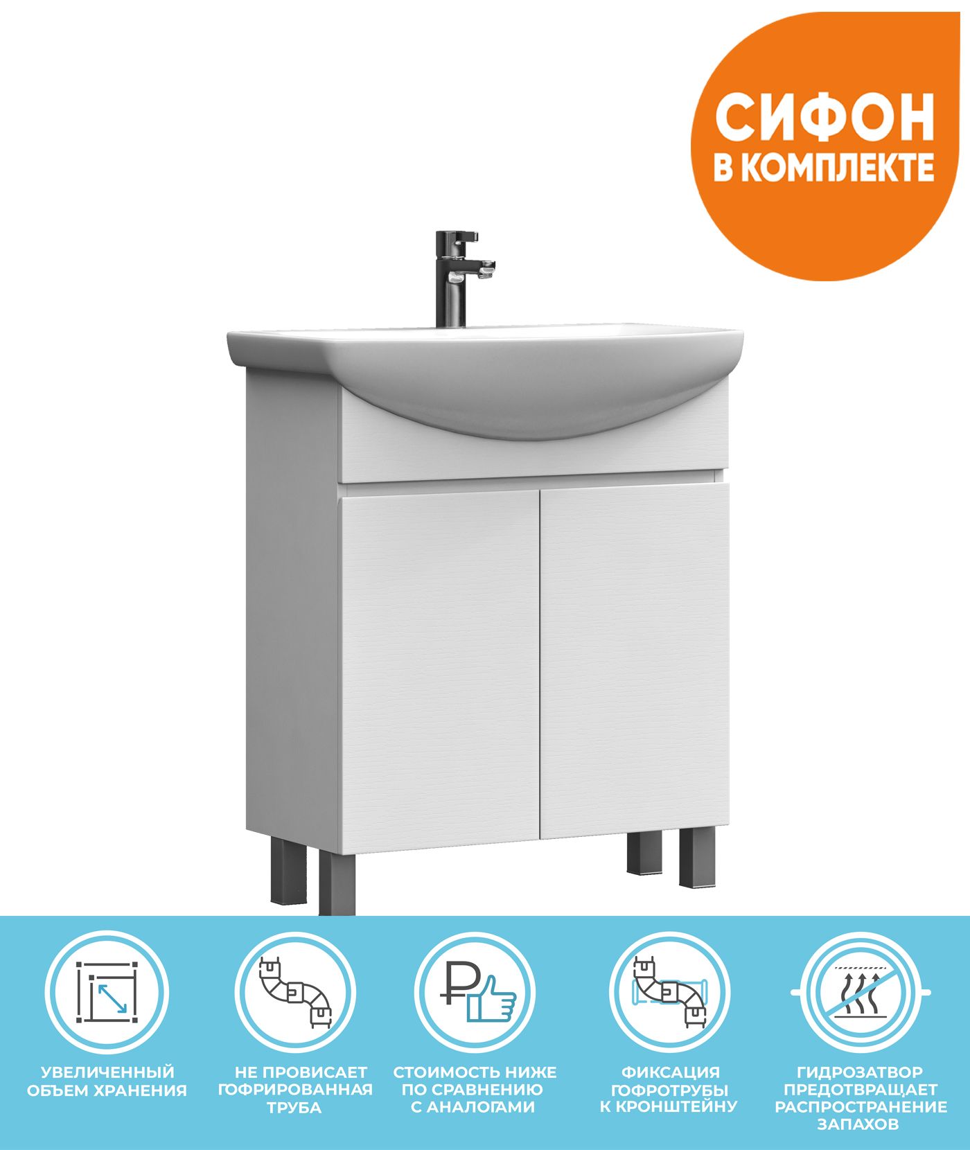 2 дверцы, 1 полка ЛДСП, опоры регулируемые квадратные. Специальный сифон Vigo в комплекте.Материал корпуса и фасада: влагостойкая ЛДСПДверцы: петли с механизмом плавного закрыванияОтсутствие лицевой фурнитуры – интегрированная в фасад ручка