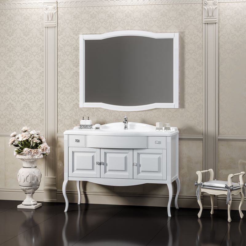 Тумба под раковину Opadiris Лаура 120 Z0000012472. Цвет: белый матовый.Выполнена в классическом стиле с плавными изогнутыми формами и изящными гнутыми ножками. Фасадные элементы украшены резными узорами. Особую роскошь добавляют ручки инкрустированные кристаллами Swarovski.Материал фасада/корпуса: массив бука/влагозащищенный МДФ.