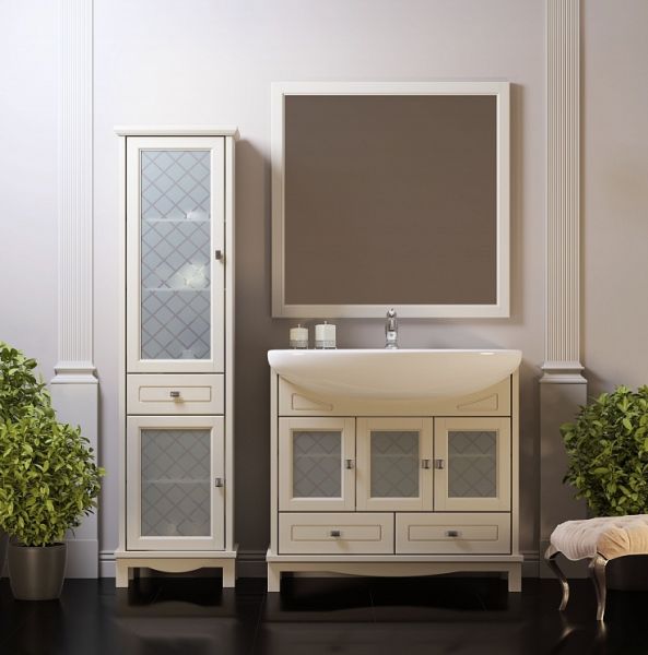 Тумба под раковину Opadiris Омега 65 00-00003138. Цвет: слоновая кость.Элегантные и лаконичные формы изделия идеально впишутся в любой интерьер в стиле прованс. Фасадные элементы украшены оригинальными ромбовидными узорами стеклянных витражей.Материал фасада/корпуса: массив бука+филенка МДФ/массив бука+ЛДСП.