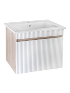 Тумба с раковиной – это изысканность и утончённая роскошь в интерьере. Волнистые рифленые фасады визуально «оживляют» и «приводят в движение» всю обстановку комнаты, сохраняя при этом умиротворение и покой, превосходно сочетаются с древесной фактурой и текстурой необработанного натурального камня корпуса. В комплект мебели входят: тумба с раковиной. Тумба под раковину в ванную Модена оснащена выдвижным ящиком на шариковых направляющих. Цвет корпуса в двух цветах: текстура светлого дерева или необработанного натурального камня. Цвет фасада классический – белый глянец, идеально впишутся в любой интерьер ванной комнаты. Тумба для ванной комплектуется накладной керамической раковиной «Оскар» (660х470 мм). Раковина глубиной 19 см. Мебель для ванной RUNO - красота и практичность в мелочах, комплект мебели Модена – лучший выбор для Вашей ванной комнаты!