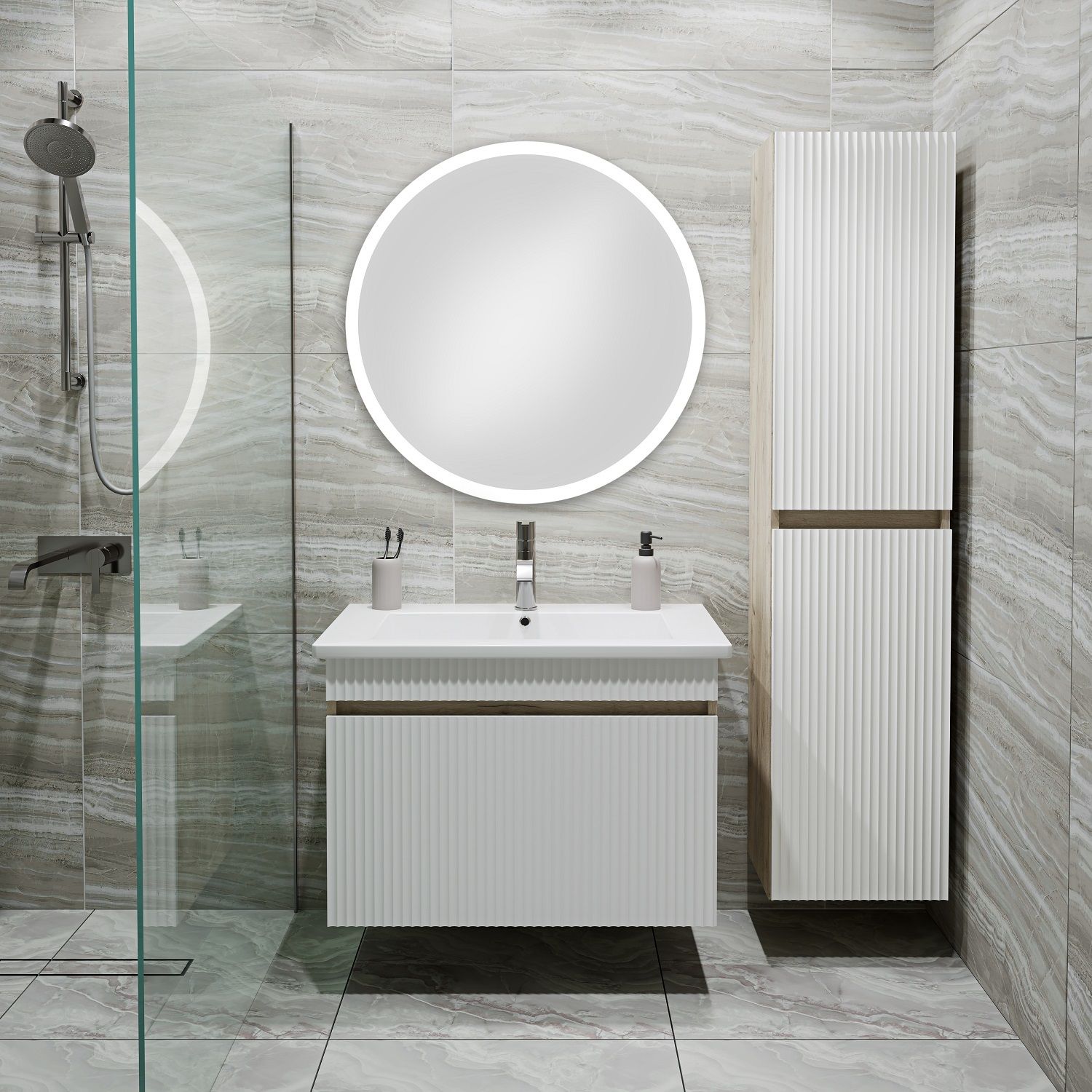 Тумба с раковиной RUNO МОДЕНА – это изысканность и утончённая роскошь в интерьере. Волнистые рифленые фасады визуально «оживляют» и «приводят в движение» всю обстановку комнаты, сохраняя при этом умиротворение и покой, превосходно сочетаются с древесной фактурой и текстурой необработанного натурального камня корпуса. В комплект мебели входят: тумба с раковиной. Тумба под раковину в ванную Модена оснащена выдвижным ящиком на шариковых направляющих. Цвет корпуса в двух цветах: текстура светлого дерева или необработанного натурального камня. Цвет фасада классический – белый глянец, идеально впишутся в любой интерьер ванной комнаты. Тумба для ванной комплектуется накладной керамической раковиной «Оскар» (770х470 мм). Раковина глубиной 19 см. Мебель для ванной RUNO - красота и практичность в мелочах, комплект мебели Модена – лучший выбор для Вашей ванной комнаты!