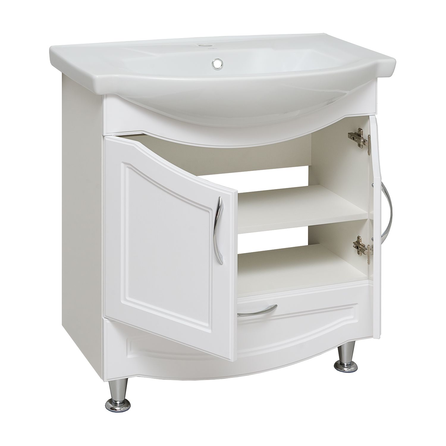 Тумба под умывальник напольная с двумя распашными дверками и нижним выдвижным ящиком. За фасадами - одна встроенная полка. Петли со встроенным доводчиком, ящик - на шариковых направляющих полного выдвижения, ручки - 3шт, ножки хром - 2шт, ножки пластик -2шт.