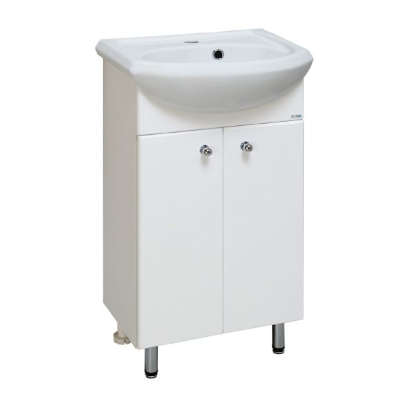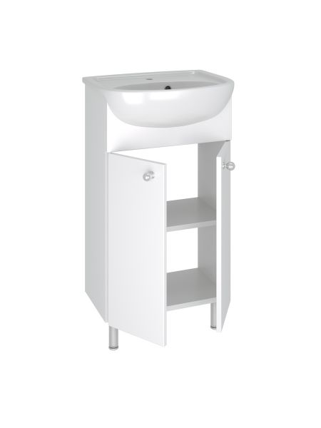 Тумба под умывальник напольная с двумя распашными фасадами и одной внутренней полкой. Петли со встроенным доводчиком, ручки - 2шт, ножки хром - 2шт, ножки пластик -2шт.
