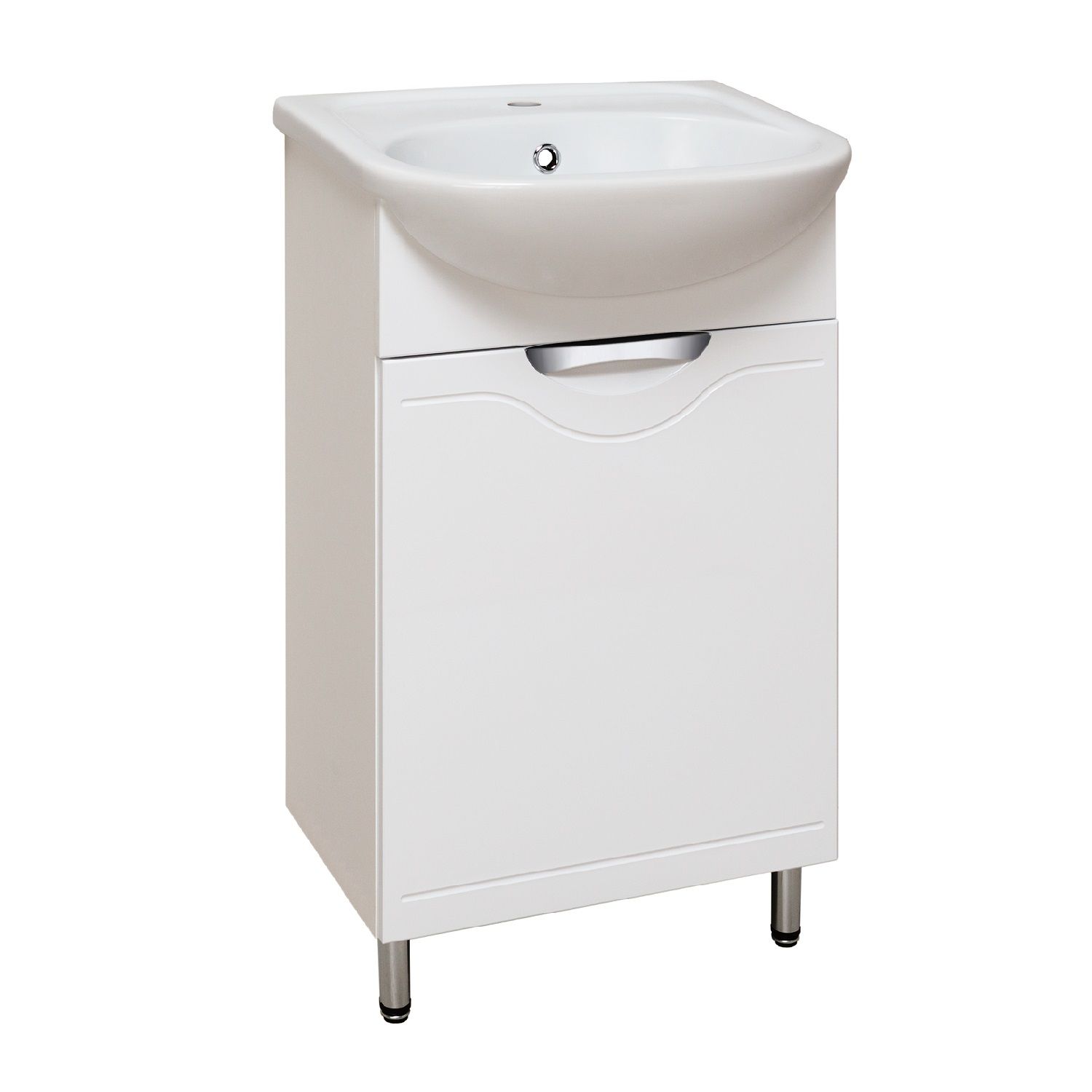 Тумба под умывальник напольная с одним распашным фасадом, открывающимся слева направо (петли справа). Петли со встроенным доводчиком, ручка врезная - 1шт, ножки хром - 2шт, ножки пластик -2шт.