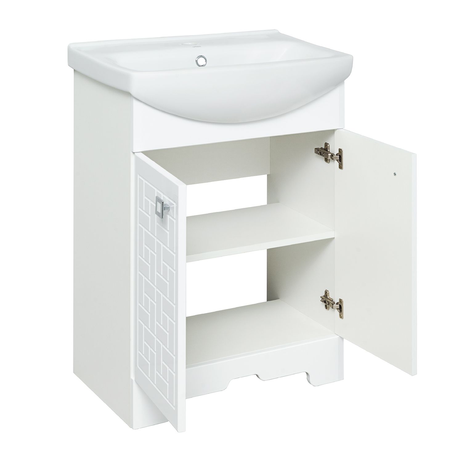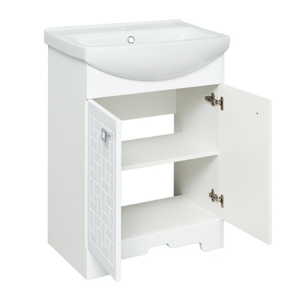 Тумба под умывальник напольная с двумя распашными фасадами и одной внутренней полкой. Петли со встроенным доводчиком, ручки - 2шт. Устанавливается на 4-е пластиковые опоры, которые скрыты за нижней фальшь-панелью.