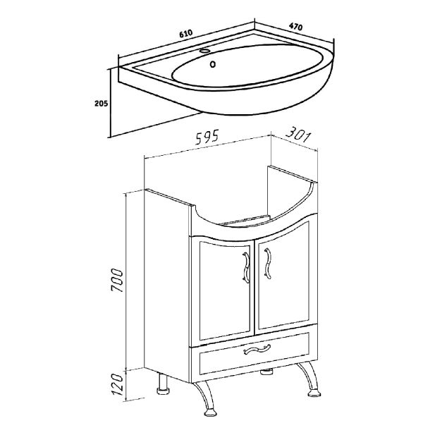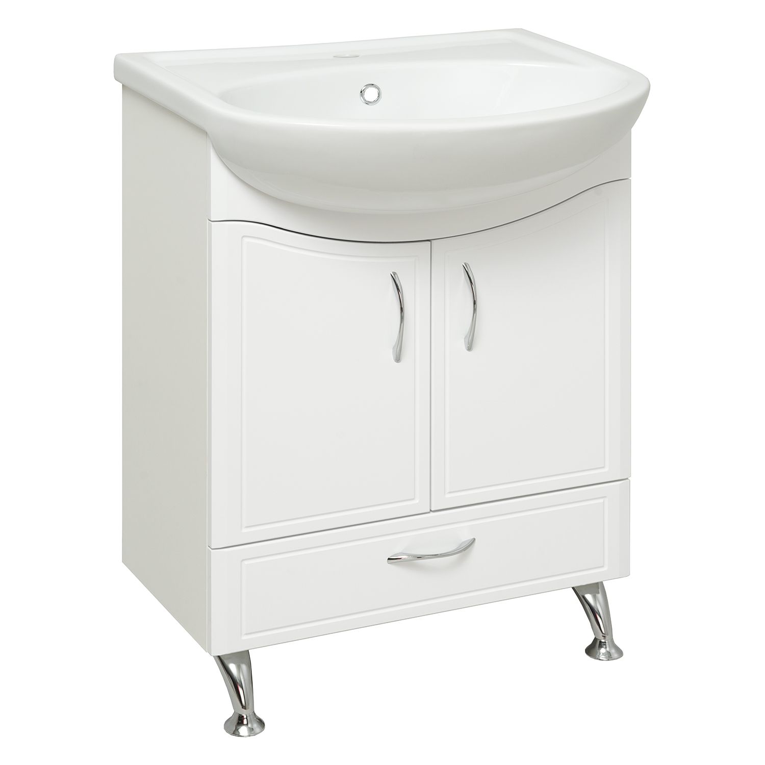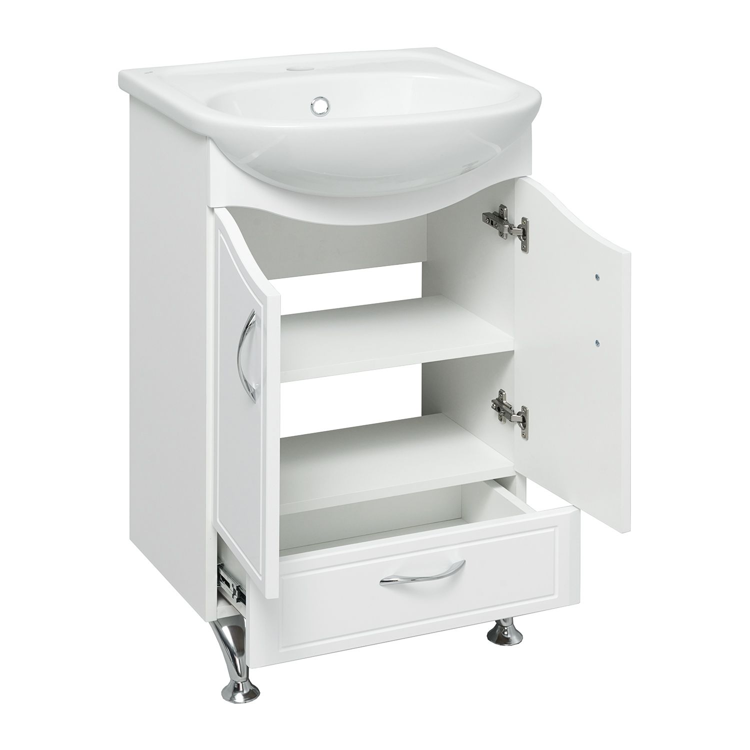 Тумба под умывальник напольная с двумя распашными фасадами и нижним выдвижным ящиком. За фасадами - одна встроенная полка. Петли со встроенным доводчиком, ящик - на шариковых направляющих, ручки - 3шт, ножки хром - 2шт, ножки пластик -2шт.