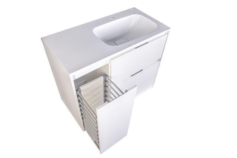 Тумба под раковину Style Line El Fante Барселона 90 Люкс Plus, 90 см, напольная, 2 ящика, с корзиной справа/слева, белыйОсновные характеристики:Тумба под раковину с выкатной бельевой корзиной