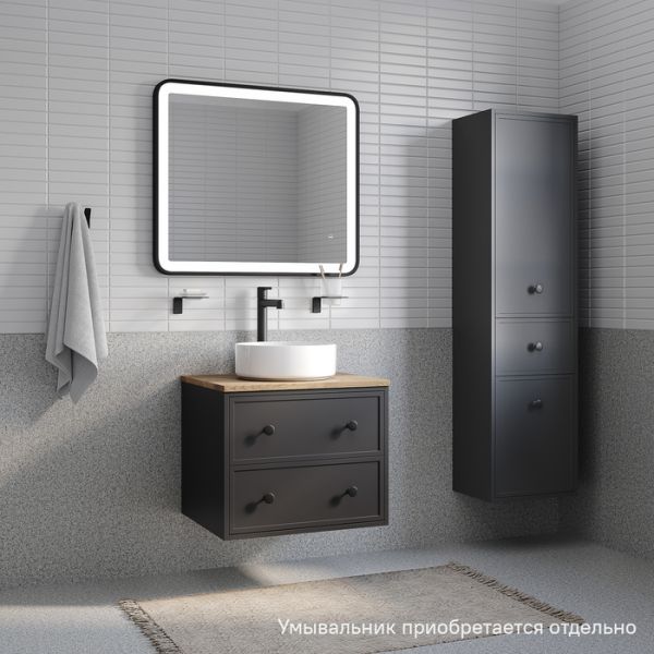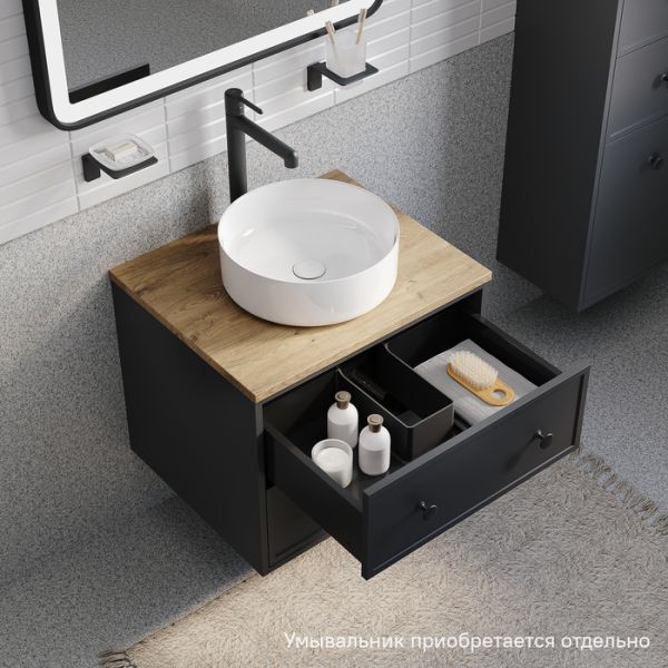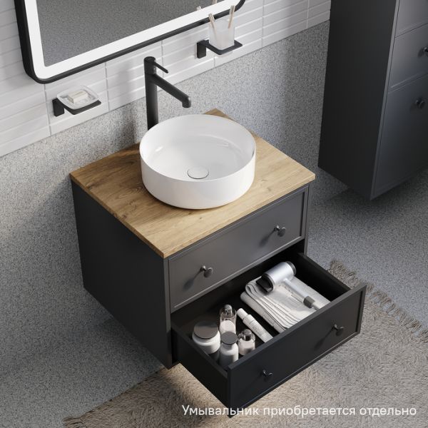 Компактная подвесная тумба Torr трендового темно-серого цвета со столешницей из МДФ в оттенке дуба верона. Сочетает в себе узнаваемый стиль и практичность популярного скандинавского дизайна. Ее четкие формы, теплый цвет дерева, фасады с декоративной филенкой, круглые ручки смотрятся гармонично и впишутся в любой современный интерьер. Подойдет любой накладной умывальник, покупается отдельно.