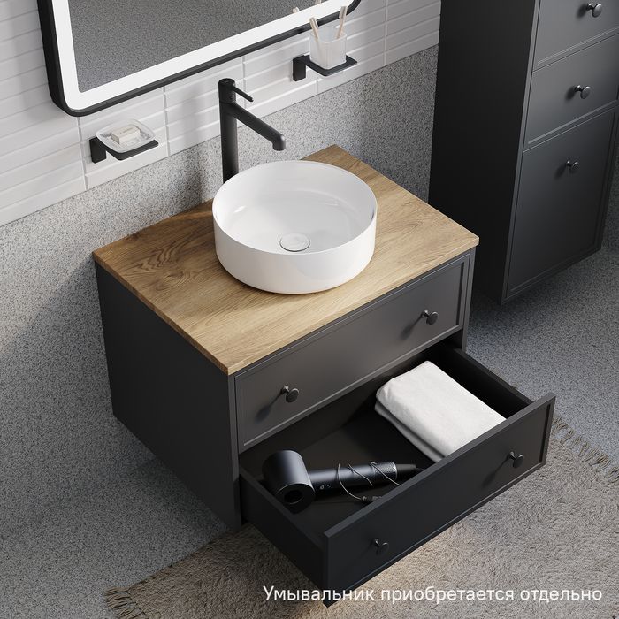Компактная подвесная тумба Torr трендового темно-серого цвета со столешницей из МДФ в оттенке дуба верона. Сочетает в себе узнаваемый стиль и практичность популярного скандинавского дизайна. Ее четкие формы, теплый цвет дерева, фасады с декоративной филенкой, круглые ручки смотрятся гармонично и впишутся в любой современный интерьер. Подойдет любой накладной умывальник, покупается отдельно.