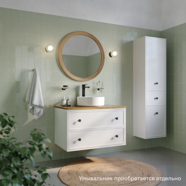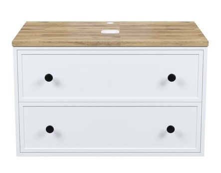 Вместительная подвесная тумба Torr классического молочно-белого цвета со столешницей из клееного натурального дуба. Сочетает в себе узнаваемый стиль и практичность популярного скандинавского дизайна. Ее четкие формы, теплый цвет дерева, фасады с декоративной филенкой, круглые ручки смотрятся гармонично и впишутся в любой современный интерьер. Подойдет любой накладной умывальник, покупается отдельно.