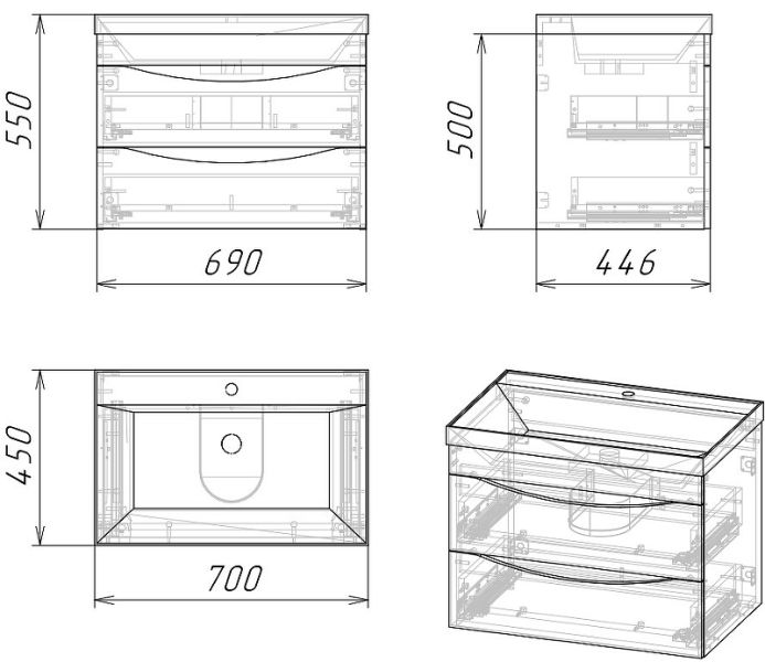 Габариты тумбы (ШхВхГ): 690х550х446 мм.