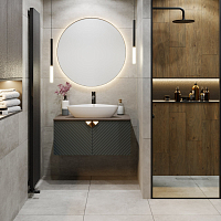 Тумба под раковину в ванную RUNO Андорра (подвесная) – это изысканность и утончённая роскошь в интерьере. Рифленые фасады визуально «оживляют» и «приводят в движение» всю обстановку комнаты, сохраняя при этом умиротворение и покой. Цвета корпуса и фасада имеют идеальное цветовое сочетание темно-зелёного и цвета коньячного дуба, которые идеально впишутся в любой интерьер ванной комнаты. Тумба оснащена двумя распашными дверцами, дверцы укомплектованы петлями верхняя с доводчиком, нижняя без доводчика. В комплекте: 2 ручки, петли со встроенным доводчиком, навесы для крепления к стене. К тумбе для ванной подойдут умывальники на столешницу: «OVALE 50» (50х36см) - идеальное решение для стильного интерьера ванной, создан для минималистичных интерьеров и подойдёт для санузлов в стиле лофт, минимализм и хай-тек. Строгая овальная геометрически правильная форма раковины, усиливает идею лаконичности в дизайне, устанавливается на столешницу, накладным методом. «PALLA D41» (диаметр 41см) - идеальное решение для стильного интерьера ванной, создан для минималистичных интерьеров и подойдёт для санузлов в стиле лофт, минимализм и хай-тек. Строгая круглая геометрически правильная форма раковины, усиливает идею лаконичности в дизайне, устанавливается на столешницу, накладным методом. «TRE 48» (48х37см) - идеальное решение для стильного интерьера ванной, создан для минималистичных интерьеров и подойдёт для санузлов в стиле лофт, минимализм и Хай-Тек. Строгая прямоугольная форма с округлыми углами усиливает идею лаконичности в дизайне, устанавливается на столешницу, накладным методом. «TERZO 60» (59х39см) - идеальное решение для стильного интерьера ванной, создан для минималистичных интерьеров и подойдёт для санузлов в стиле лофт, минимализм и хай-тек. Асимметричная раковина, которую можно установить любой стороной, дизайнерское решение для нестандартных интерьеров, усиливает идею лаконичности в дизайне, устанавливается на столешницу, накладным методом. И другие накладные раковины бренда RUNO.
