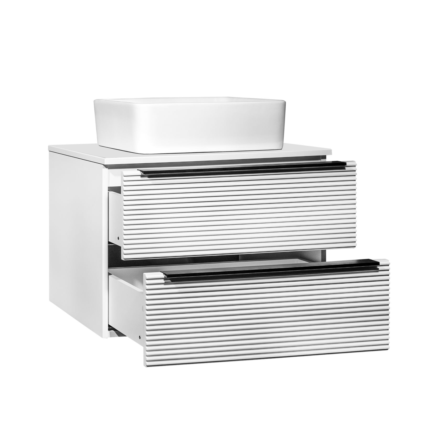 Тумба под раковину в ванную RUNO Орлеан (подвесная) – это изысканность и утончённая роскошь в интерьере. Рифленые фасады визуально «оживляют» и «приводят в движение» всю обстановку комнаты, сохраняя при этом умиротворение и покой. Цвета корпуса и фасада имеют идеальное классическое цветовое сочетание глянцевого и матового белого цвета, которые идеально впишутся в любой интерьер ванной комнаты. Тумба в ванную оснащена двумя выдвижными ящиками на шариковых направляющих, оснащенных системой плавного закрывания. В комплекте входят: две металлические ручки, навесы для крепления к стене. К тумбе для ванной подойдут умывальники на столешницу: «OVALE 50» (50х36см) - идеальное решение для стильного интерьера ванной, создан для минималистичных интерьеров и подойдёт для санузлов в стиле лофт, минимализм и хай-тек. Строгая овальная геометрически правильная форма раковины, усиливает идею лаконичности в дизайне, устанавливается на столешницу, накладным методом. «PALLA D41» (диаметр 41см) - идеальное решение для стильного интерьера ванной, создан для минималистичных интерьеров и подойдёт для санузлов в стиле лофт, минимализм и хай-тек. Строгая круглая геометрически правильная форма раковины, усиливает идею лаконичности в дизайне, устанавливается на столешницу, накладным методом. «TRE 48» (48х37см) - идеальное решение для стильного интерьера ванной, создан для минималистичных интерьеров и подойдёт для санузлов в стиле лофт, минимализм и Хай-Тек. Строгая прямоугольная форма с округлыми углами усиливает идею лаконичности в дизайне, устанавливается на столешницу, накладным методом. «TERZO 60» (59х39см) - идеальное решение для стильного интерьера ванной, создан для минималистичных интерьеров и подойдёт для санузлов в стиле лофт, минимализм и хай-тек. Асимметричная раковина, которую можно установить любой стороной, дизайнерское решение для нестандартных интерьеров, усиливает идею лаконичности в дизайне, устанавливается на столешницу, накладным методом. И другие накладные раковины бренда RUNO.