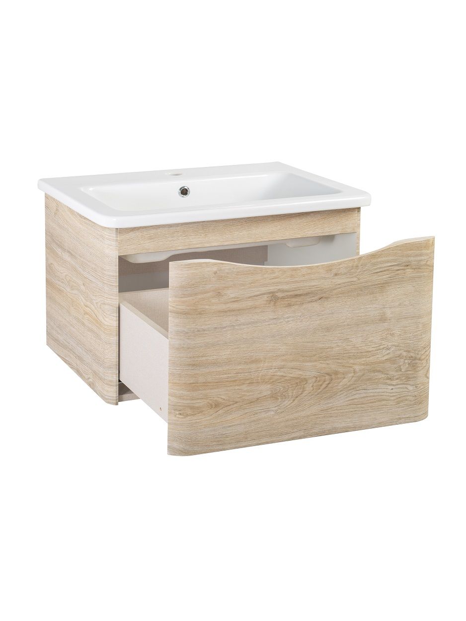 Тумба с раковиной в ванную Runo Тоскана (подвесная) - выполнена в ультрасовременном дизайне в цвете светлое дерево. Тумба под раковину отличается изысканным дизайном, скруглённые углы тумбы, древесная текстура фасада, врезная ручка – придают мебели необычный и незабываемый внешний вид. Тумба в ванную оснащена выдвижным ящиком на шариковых направляющих, с системой плавного закрывания. Тумба под раковину ТОСКАНА гармонично впишется в любой интерьер ванной комнаты. Тумба для ванной комплектуется накладным керамическим умывальником Никсон 80 (800х460 мм) ТМ Dreja, необычный дизайн которого сочетание строгих линий прямоугольника со скруглёнными углами, отражают современные тренды в дизайне. Раковина глубиной 16 см. Мебель для ванной комнаты RUNO - красота и практичность в мелочах!