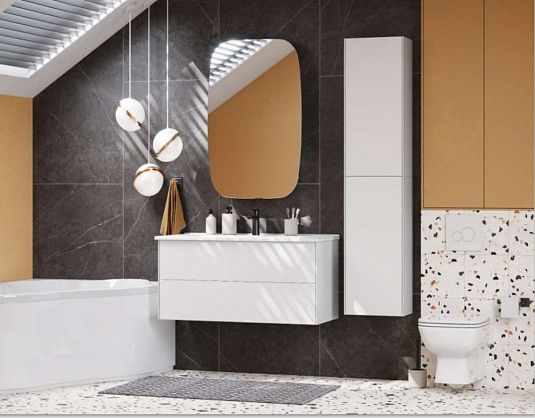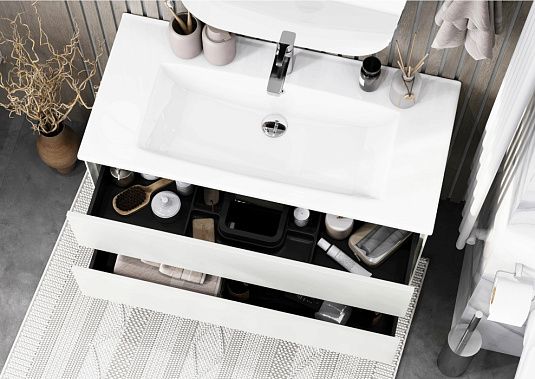 Тумба с раковиной Акватон Сохо 100 1A2582K2AJ010 100 смТумба Сохо 100 функционально состоит из двух вместительных ящиков, оснащенных системой push to open, обеспечивающей надежное, комфортное и бесшумное закрывание. Фасады изделия выполнены из МДФ в белой глянцевой покраске, корпус из ламинированной влагостойкой ДСП в покраске белый глянец. Верхний и нижний ящики оснащены системой организации пространства, которая позволяет содержать косметические средства в идеальном порядке. Дополняет тумбу стильная раковина Элина от бренда Santek с удобной чашей. Все внутренние детали тумбы выполнены в цвете антрацит.