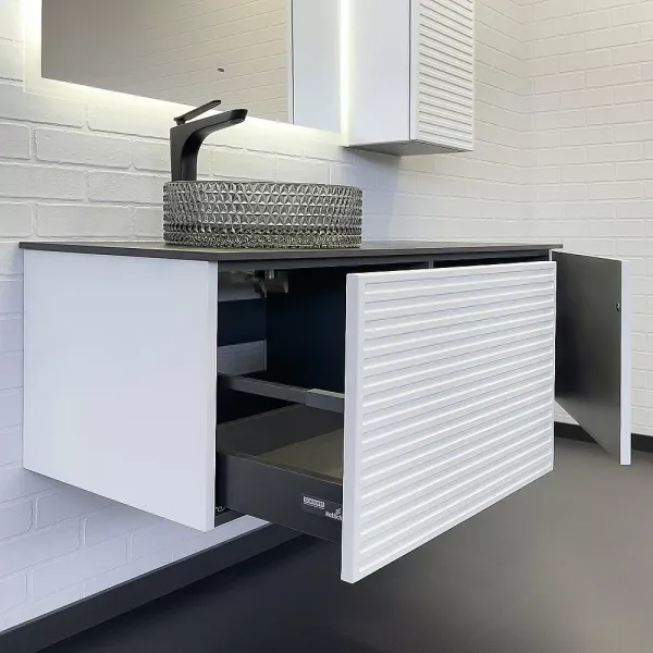 • Подвесная тумба-умывальник с одним выкатным ящиком и створкой.