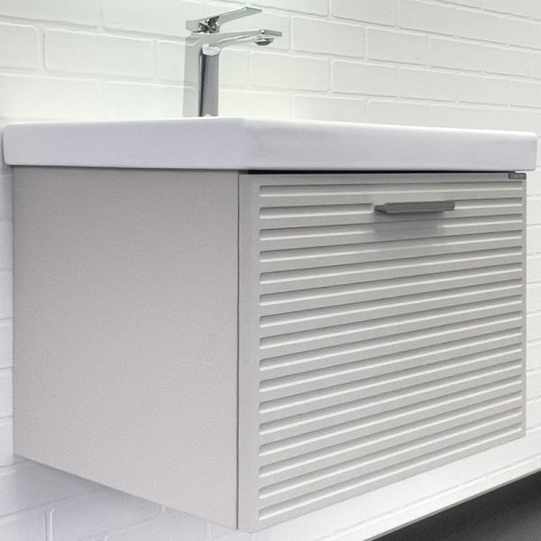 Фасад тумбы из МДФ фрезерован горизонтальным узором и обтянут в пленку цвета "серый шёлк".