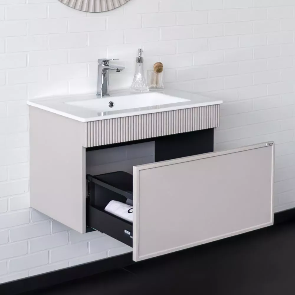 Комплектация: керамическая раковина Comforty 70EПодвесная тумба с одним большим выкатным ящиком оборудованным направляющими с системой плавного закрывания. Корпус тумбы изготовлены из влагостойкого ЛДСП. Фасад тумбы из МДФ фрезерован кантом по периметру. Подпорная царга фрезерована вертикальным узором. Корпус и фасад тумбы затянуты в матовую пленку цвета "серый шёлк". Тумба подготовлена для подключения водоснабжения снизу и сзади.