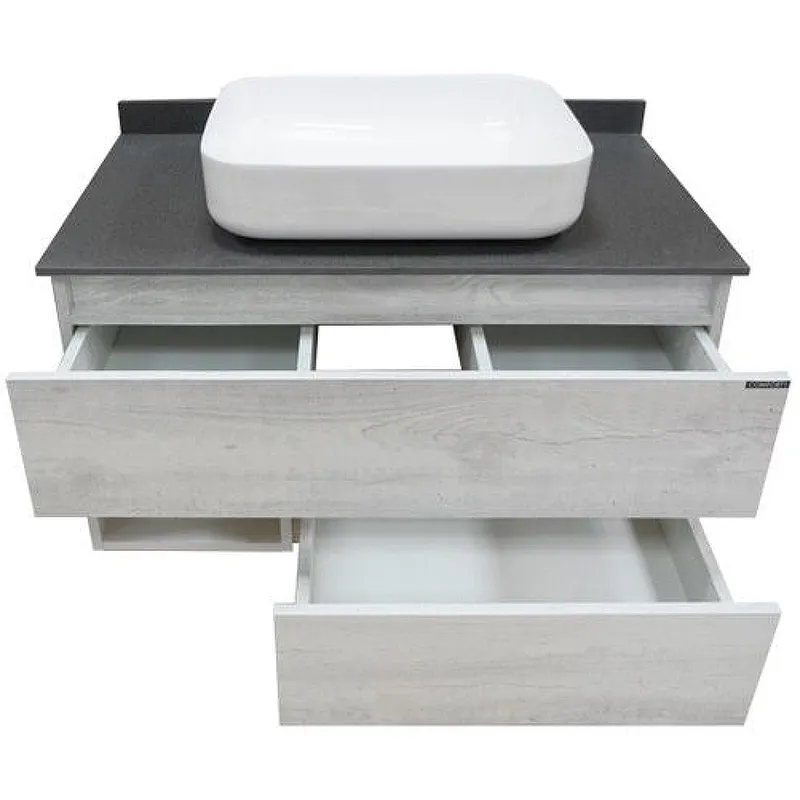 Характеристики: Тумба: Цвет: дуб белый, белый глянец. Цвет столешницы: графит. Материал тумбы: влагостойкий ЛДСП. Материал столешницы: керамогранит. Организация хранения: два ящика с системой плавного закрывания, открытая полка. Монтаж: подвесной. Раковина-чаша: Цвет: белый. Материал: санфарфор. Форма: прямоугольная. В комплекте поставки: тумба, столешница, раковина-чаша Comforty T-Y9378, крепежный комплект