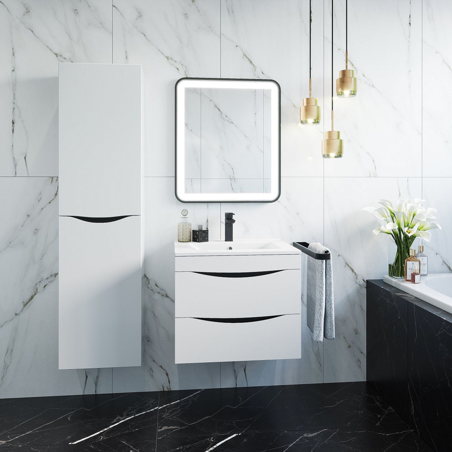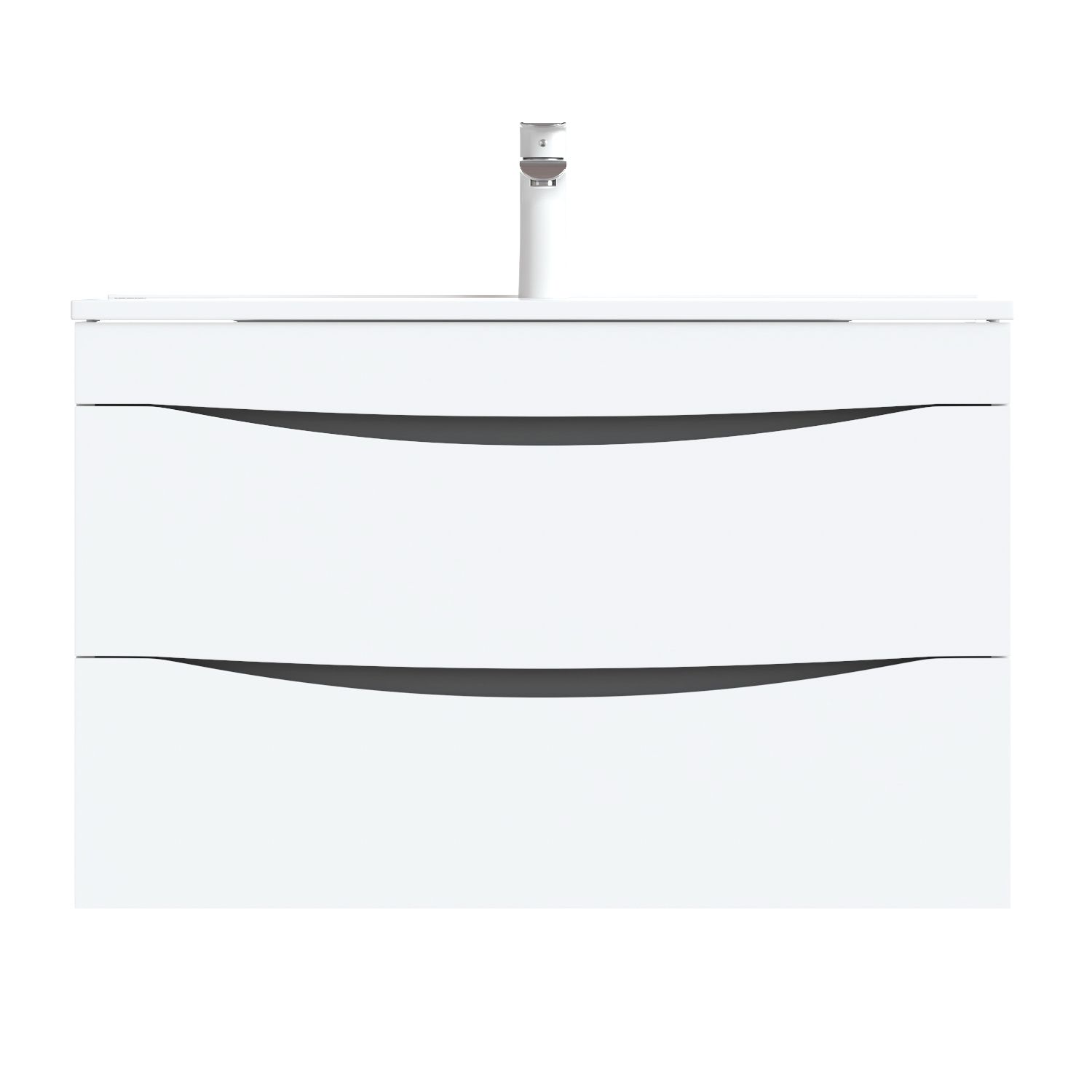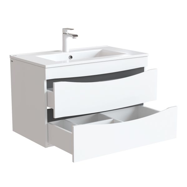 Тумба с умывальником для ванной комнаты, подвесная. Размеры тумбы без умывальника: 455х799х500 мм (ДхШхВ). Размеры умывальника: 465х800х175 мм (ДхШхВ). Фасад МДФ 19 мм в эмали (белая), фрезеровка. Корпус влагостойкий ЛДСП 16 мм в эмали. Интегрированные ручки. Два выдвижных ящика с механизмом плавного доведения. Пластиковый ограничитель под сифон в верхнем ящике. Перекатной организатор в нижнем ящике. Навесы усиленные с планкой. Упаковка: картон, пленка, пенопластовые уголки.