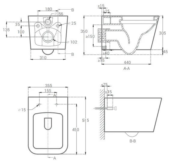 • Прилегание унитаза к стене: