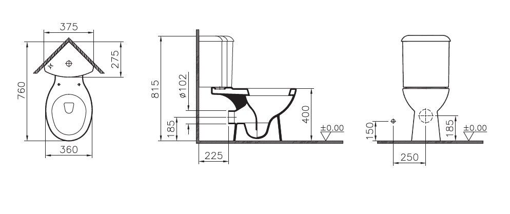 Чаша примыкает: бачок примыкает вплотную к стене, чаша унитаза не примыкает к стене