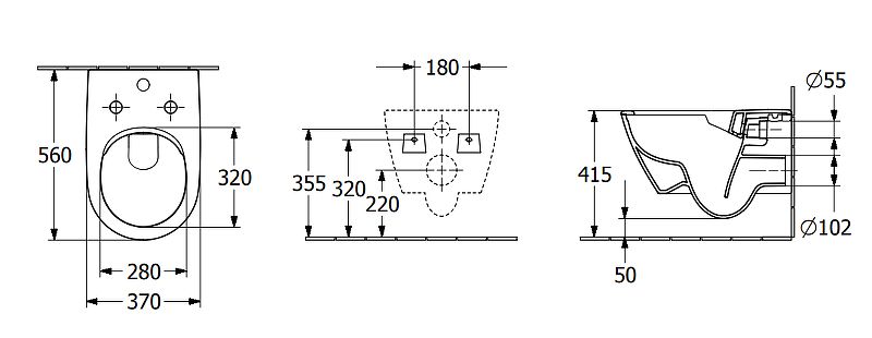 Габариты чаши унитаза (ШхВхД): 370х365х560 мм.