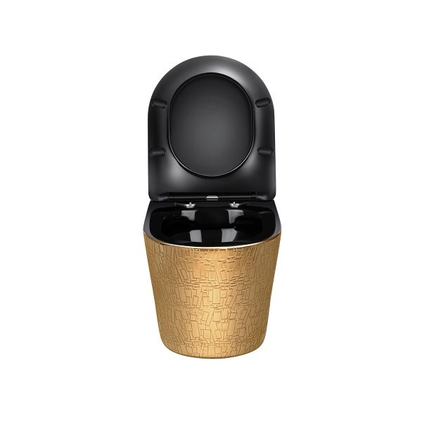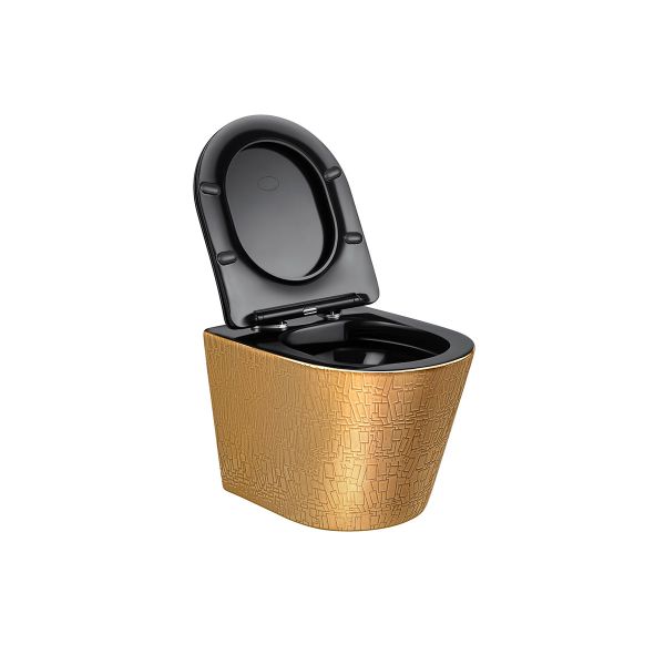 520х360х370Подвесной унитаз Vincea Piatti в черно-золотом исполнении – это эргономичное и элегантное решение для современной ванной комнаты. Унитаз изготовлен из высокопрочного фарфора. Внешняя часть чаши – покрытие золото с текстурой, внутренняя – глянцевый черный цвет, черная крышка. Унитаз укомплектован элегантным ультратонким быстросъемным сиденьем из дюроплласта с плавным опусканием черного цвета.