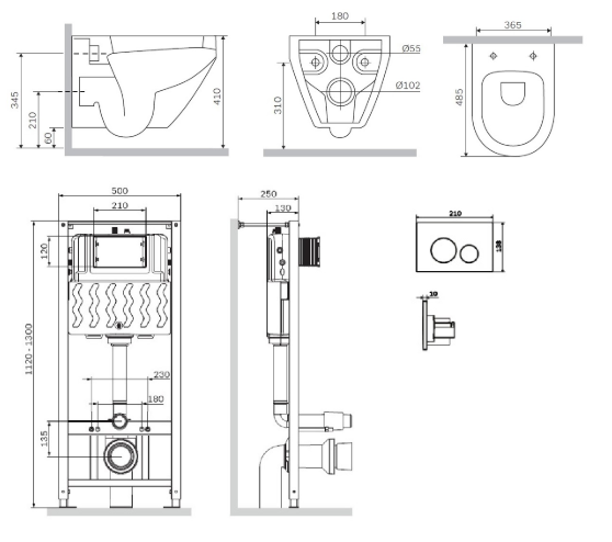 Полностью готовый к установке комплект: система инсталляции с клавишей, подвесной унитаз сиденьем.Не разборная рама из стального профиля выдерживает нагрузку до