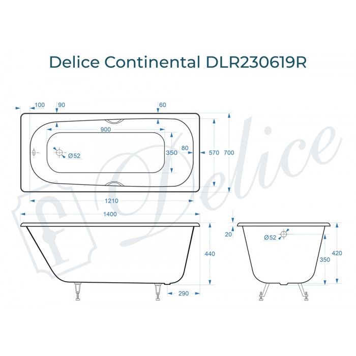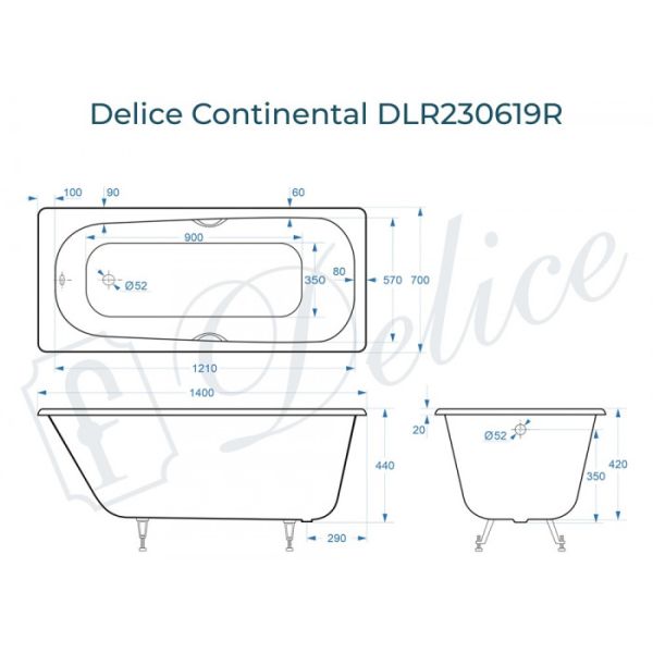 Ванна чугунная Delice Continental DLR230619R 140х70 с отверстиями под ручки купить