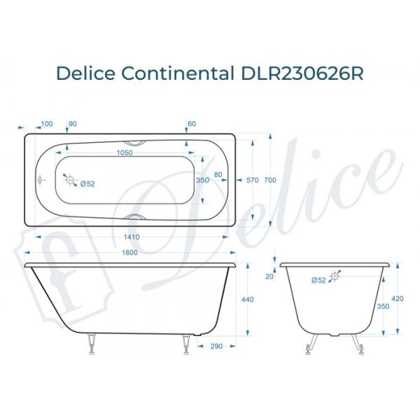 Ванна чугунная Delice Continental DLR230626R 160х70 с отверстиями под ручки купить