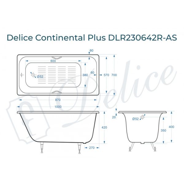Ванна чугунная Delice Continental PLUS 100х70 с отверстиями под ручки и антискользящим покрытием