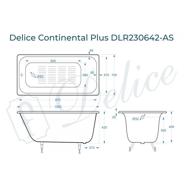 Ванна чугунная Delice Continental PLUS DLR230642-AS 100х70 с антискользящим покрытием