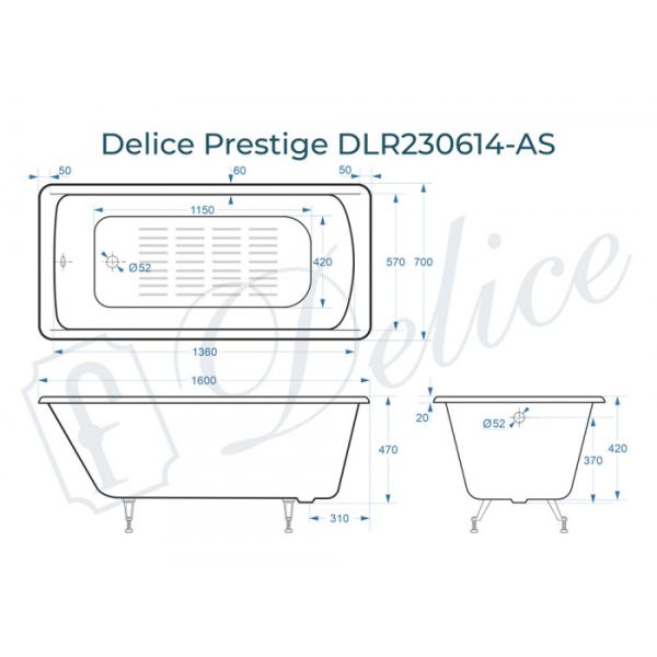 Ванна чугунная Delice Prestige DLR230614-AS 160х70 с антискользящим покрытием