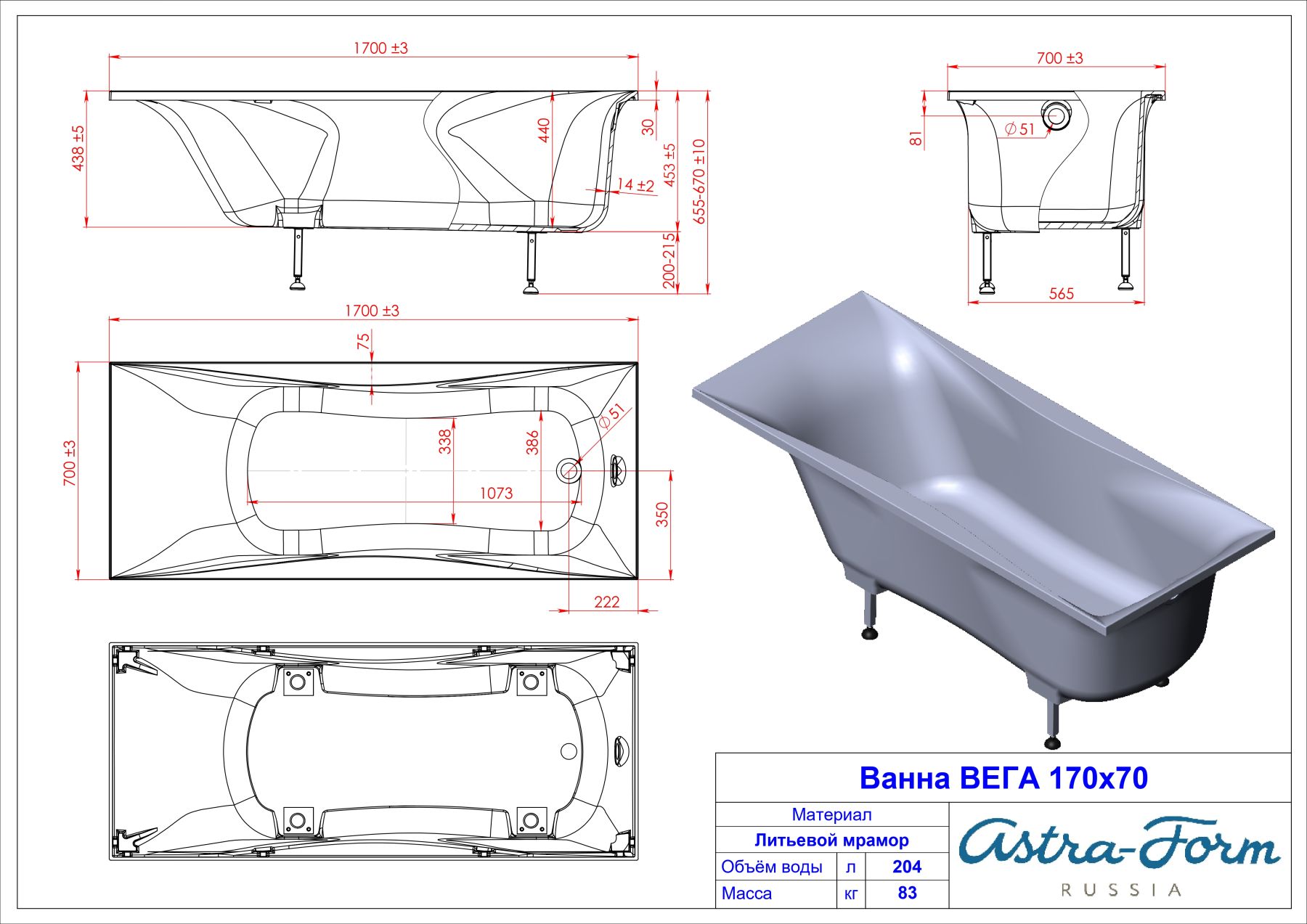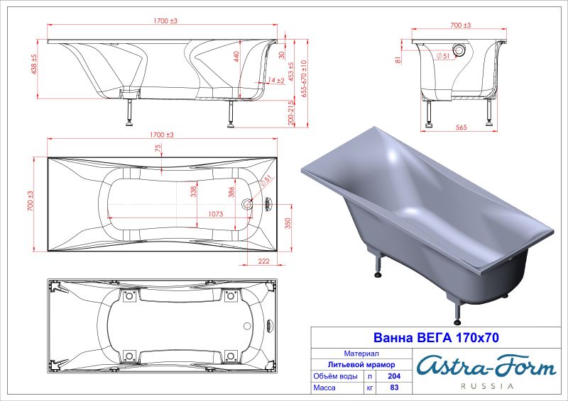 Ванна из искусственного камня Astra-Form Вега 01010002 170x70 см белый глянец