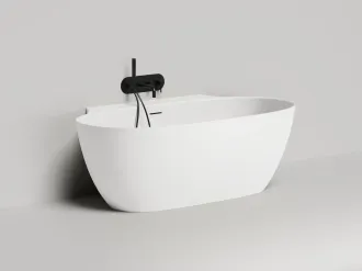 Эта модель соединяет в себе классическую овальную форму изголовий и спрятанный за ними пристенный борт. Благодаря такой конструкции создаётся впечатление отдельностоящей ванны, но сохраняется практичность плотного примыкания к стене и дополнительной поверхности для хранения косметических средств и аксессуаров. При желании здесь также можно разместить и смеситель. Более тонкая, детальная проработка формы чаши позволила уйти от классического понимания пристенной ванны с массивной боковой проекцией: блок, соприкасающийся со стеной, будто утоплен вдоль задней поверхности. Такова новая эстетика облегчённого дизайнерского решения Salini.