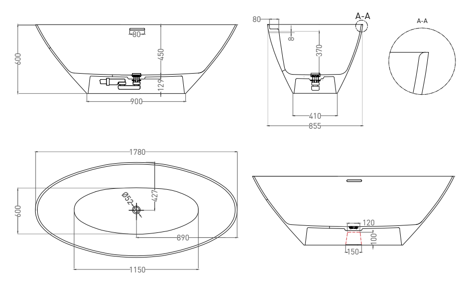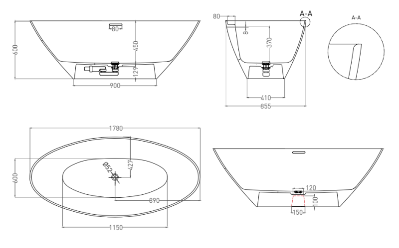 Ванна из искусственного камня Salini Diva S-Stone 102221MRF 178x85см RAL полностью