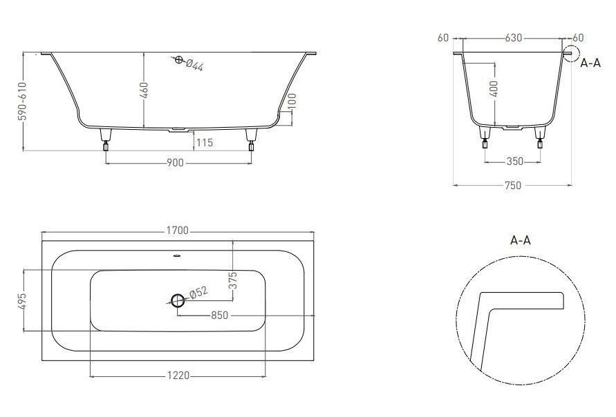 Она предназначена как для полного или частичного встраивания, так и для пристенной или угловой установки. Ванна характеризуется одинаковым уклоном бортов и расположенными посередине сливом-переливом и донным клапаном. Название модели Axis («Ось) отражает характерную симметрию ванны во фронтальной проекции.