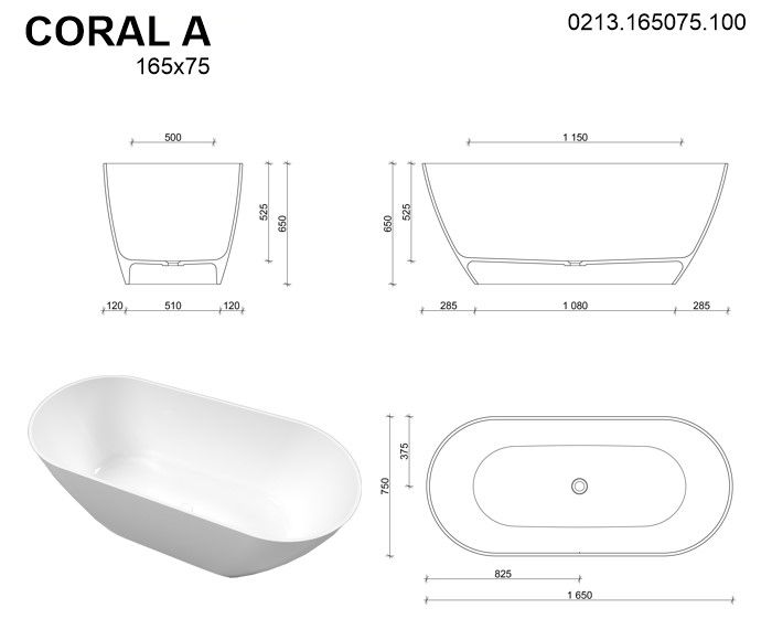 Ванна из искусственного камня Whitecross Coral A 0213.165075.100 165x75см белый глянец купить