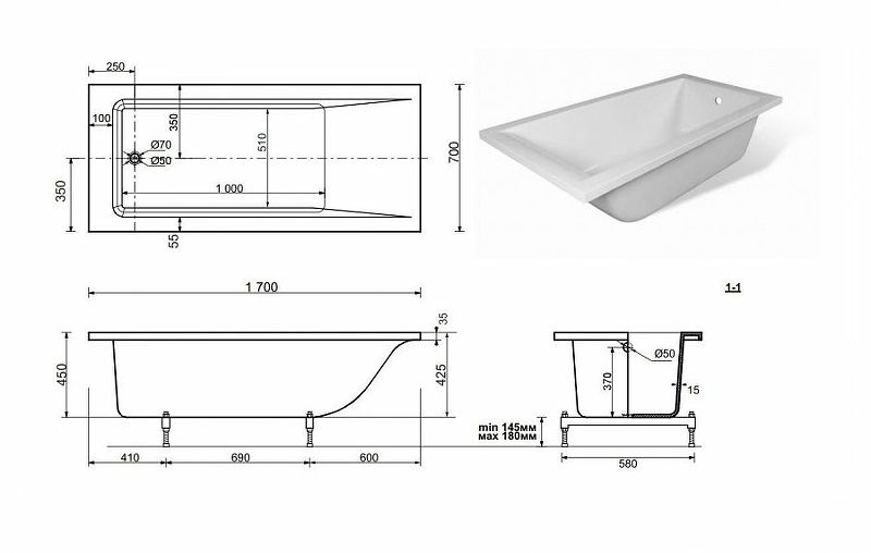 Ванна из литьевого мрамора Эстет Дельта 170А ФР-00000651 170x70см белый