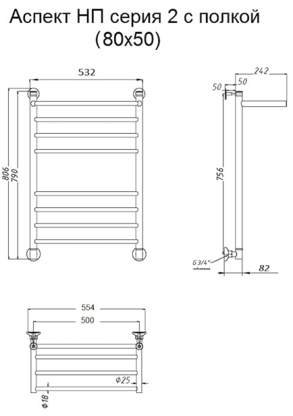 Водяной полотенцесушитель Тругор Аспект НП 2 П с полкой 80x50см хром Аспект2/нп8050П