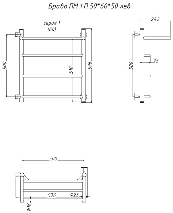 Водяной полотенцесушитель Тругор Браво ПМ 1 П 50x60x50см с полкой левый хром Браво1/ПМ506050Плев