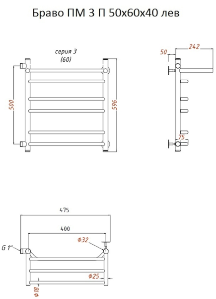 Водяной полотенцесушитель Тругор Браво ПМ 3 П 50x60x40см с полкой левый хром Браво3/ПМ506040Плев