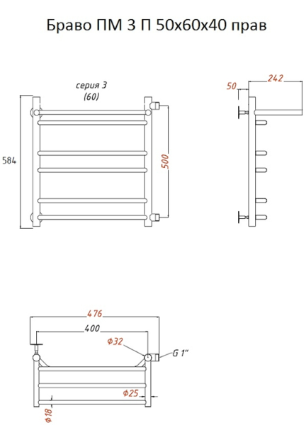 Водяной полотенцесушитель Тругор Браво ПМ 3 П 50x60x40см с полкой правый хром Браво3/ПМ506040Пправ