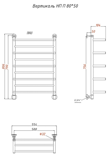 Водяной полотенцесушитель Тругор Вертикаль НП П с полкой 80x50см хром Вертикаль/нп8050П
